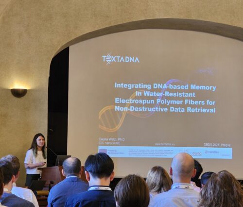 Dr. Cecilia Weltz presented her work on the development of a polymeric fiber library to store information-bearing oligonucleotides for non-destructive data retrieval. Taking advantage of intrinsic chemical properties of polymers, but also applying processes such as crosslinking, she showed water resistance of the fibers and the ability to store and retrieve DNA on demand.